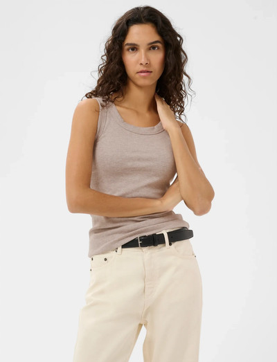 This sleeveless top features a close fit and a classic round neckline, making it a versatile addition to any wardrobe. The ribbed texture adds subtle detail, perfect for layering or wearing on its own.