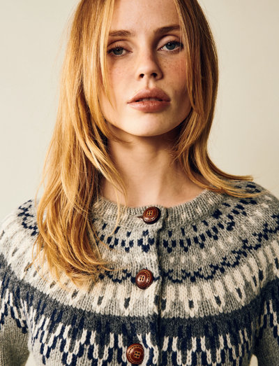 A lovely knitted cardigan in 100% wool with a folkloric pattern around the yoke. Large woodenlooking buttons at the front. Straight, short, and loose fit with long sleeves. A true classic!