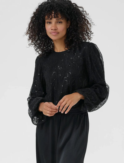 Crafted with a delicate touch, this long-sleeved blouse features a subtle sparkle, perfect for adding a touch of elegance to any ensemble. The lightweight fabric drapes beautifully, creating a flattering silhouette. Its refined design makes it a versatile addition to your wardrobe, easily dressed up or down for various occasions.