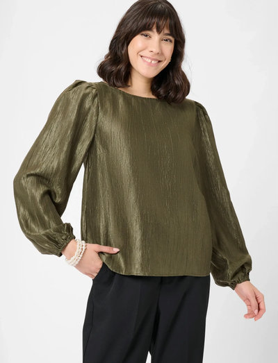 Crafted with a subtle sheen, this long-sleeve blouse offers a touch of elegance to any ensemble. The design features a classic round neckline and gently puffed sleeves, creating a flattering silhouette. Pair it with tailored trousers for a sophisticated look, or dress it down with jeans for a more casual vibe.