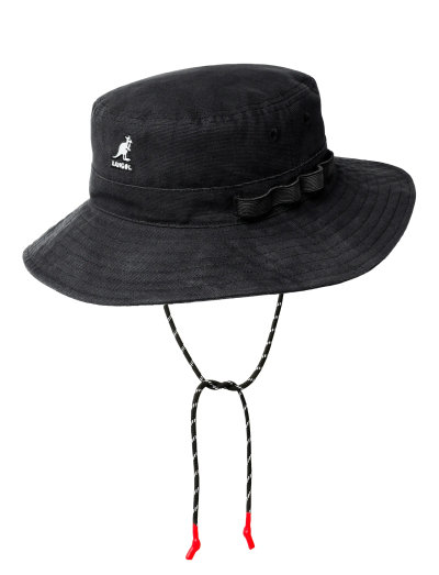 The Utility Cords Jungle Hat is a new favorite style crafted from a cotton canvas in a wider brim bucket shape. It features utility loops and a chin cord. The cords are finished with a dipped color tip for an a