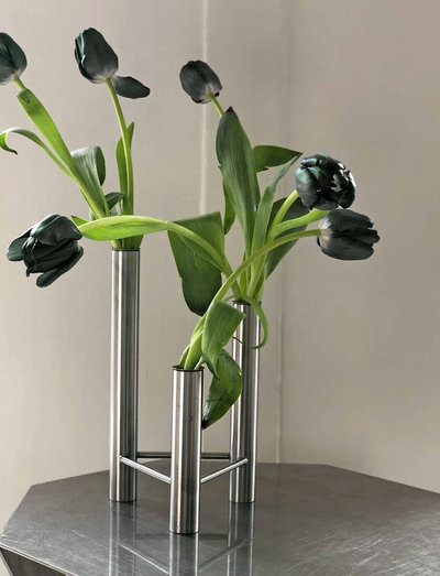 VISTA is originally a candlestick in silver, designed by Kay Bojesen in the 1950s, but now put into production in a more affordable material: steel. In addition to updating the material, without changing the design language and Kay Bojesen's characteristic design language, added another function so that the stand can function as a combination of candlestick and vase.In each of the stand's cylinders an insert has been added where candles or flowers can be placed.