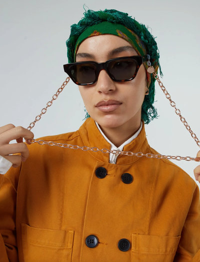 This stylish chain is perfect for keeping your sunglasses secure and easily accessible. It features a sleek rose gold finish and is designed to be both fashionable and functional.