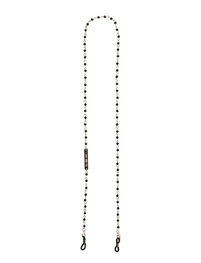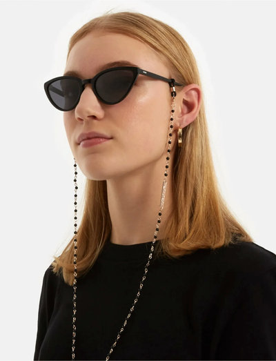 This stylish and practical sunglass chain is a great way to keep your sunglasses secure and fashionable. It features a sleek design with black beads and a gold chain, adding a touch of elegance to your look. The chain is adjustable and features a secure clasp to keep your sunglasses safe.