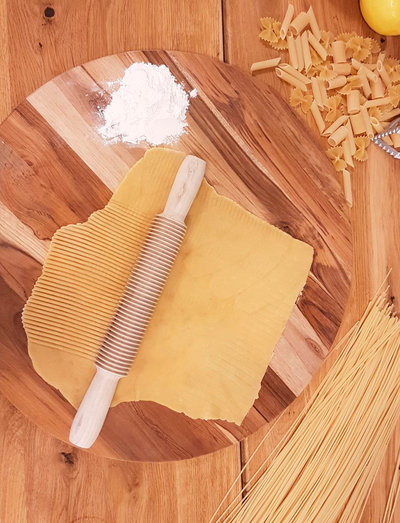 The pasta cutter is perfect to make homemade traditional spaghetti. You put a strip of flour-dusted dough on the table and roll with the pasta cutter and you will have delicious homemade spaghetti 3 mm.