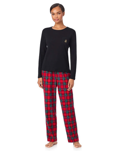 Enjoy a restful night's sleep in this comfortable pyjama set. The long-sleeved top features a crew neck and a chest pocket, while the matching bottoms have an all-over plaid pattern.