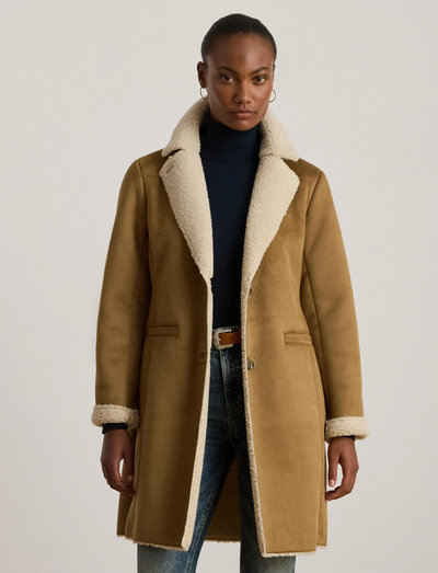 Offering a plush feel, this coat features a faux shearling lining and trim. The design includes a notched collar and a button-front closure, providing both warmth and a classic look.