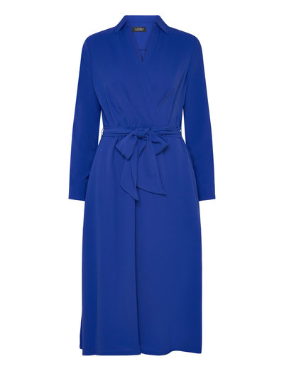 A faux-wrap bodice, a belted waist, and side on-seam pockets add to the casual allure of this midi dress, while a point collar and buttoned barrel cuffs afford sophistication. An airy georgette fabrication creates ease of movement.A-line silhouette. Intended to hit below the knee.US size 8 has a 47.75" body length and a 24" sleeve length. Dress length is taken from the center back of the neck and changes 0.5" between sizes. Sleeve length changes less than 0.25" between sizes.Point collar. Concealed left-side-seam zipper.Long sleeves with buttoned barrel cuffs. "LRL"-engraved buttons. Side on-seam pockets.
