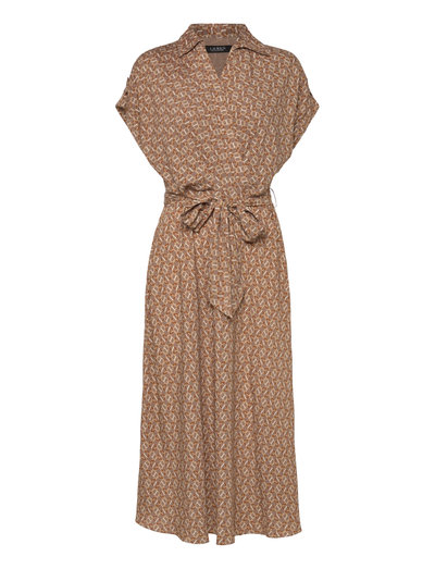 Crafted with airy crepe de chine, this dress balances a spread collar and roll-tab sleeves with a feminine surplice neckline to create a look that is casual yet refined. Detailed with “LRL”-engraved buttons, this version displays a stylized, equestrian-inspired geometric print.A-line silhouette. Intended to hit at the mid-calf.US size 8 has a 48" body length. Dress length is taken from the center back of the neck and changes 0.5" between sizes.Spread collar. Surplice neckline with a hook-and-eye closure at the center front. Concealed left-side-seam zipper.