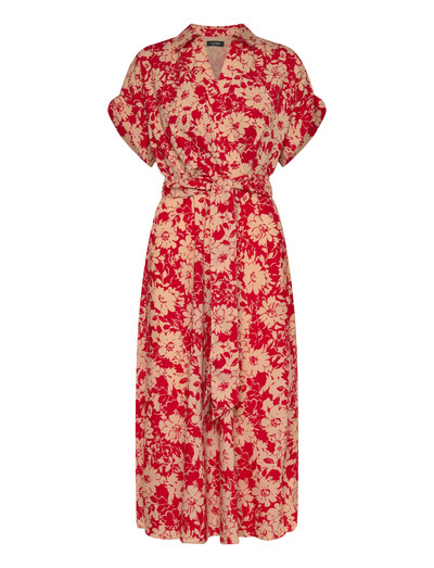 Featuring a vibrant floral pattern, this midi-length dress offers a flattering silhouette. The design incorporates a self-tie belt to cinch the waist, enhancing the figure. It's finished with short sleeves and a collared neckline.