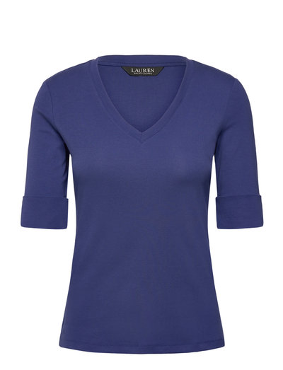 A timeless essential, this V-neck tee with elbow-length sleeves is made with breathable stretch cotton for a soft hand feel. Lauren’s signature embroidered logo at the hem completes the look.Slim fit. Intended to hit at the hip.Size medium has a 24.5" body length and an 11.25" sleeve length. Body length is taken from the high point of the shoulder. Sleeve length changes 0.25" between sizes.V-neck.