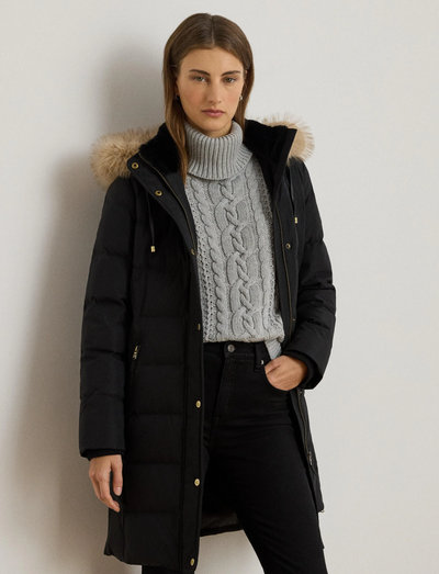Equal parts stylish and practical, this channel-quilted coat is designed with a detachable, faux fur–trimmed hood, a water-resistant shell, and cozy 450-fill-power down to keep you dry and warm. Front and back princess seams enhance this style’s streamlined silhouette, while “LRL”-engraved metal snaps add signature style.Straight fit. Intended to hit above the knee.Size small has a 35" body length, a 40" bust, and a 32.5" sleeve length. Body length and sleeve length are taken from the center back of the neck.Faux fur–trimmed detachable drawcord hood. Funnelneck. Full-zip front with a snapped storm placket. “LRL”-engraved metal snaps.