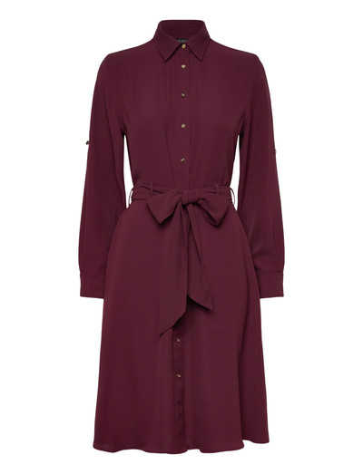 A belted waist enhances the fit-and-flare silhouette of this roll tab–sleeve shirtdress, which is tailored with fluid double-faced georgette.Fit-and-flare silhouette. Intended to hit at the knee.US size 8 has a 42.5" body length and a 32.5" sleeve length. Dress length and sleeve length are taken from the center back of the neck. Dress length changes 0.5" between sizes. Sleeve length changes 0.25" between sizes.Point collar. Buttoned placket. Buttons custom-developed with a “Lauren Ralph Lauren” logo.