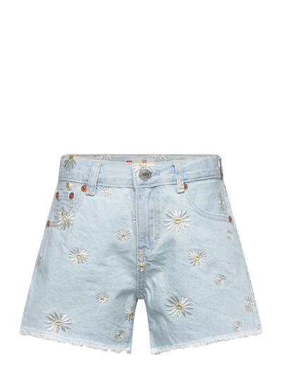 These denim A-line shorts feature an all-over daisy design, perfect for warmer weather. The frayed hem adds a touch of casual style.