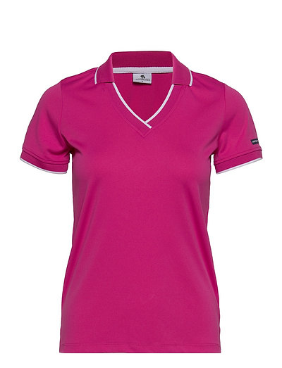 High performance golf polo in a very thin and breathable technical quality. With a nice and feminine collar without buttons. Rib collar and rib sleeve ends with contrasts. The polo is made in a very lightweight, durable, and highly breathable polyester quality with lots of stretch. No need to iron. With a discreet Lexton Links® embroidery logo badge on the left sleeve.