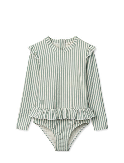 The Sille swimsuit combines a playful expression with UV protection for fun family time spent by the water. Features playful ruffles on shoulders and waist and a practical back zipper.