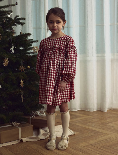 Refresh your child's wardrobe with beautiful and cool dresses perfect for any season and occasion. Woven fabric has a distinct criss-cross pattern and a lightly textured surface for a clean and classic look. - Product Type : Dress - Neck : O-Neck - Sleeve : Long Sleeves (L/S) - Cuffs : Elasticated cuffs - Closing : Button and loop fastening - Extra details : Frills, Label - Fit : Loose Fit
