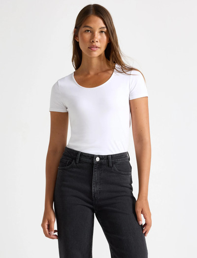 Basic T-shirt in soft and stretchy cotton with short sleeves and round neckline.