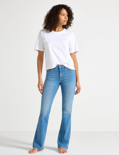 Mid waist jeans in cotton denim with stretch and flared legs.