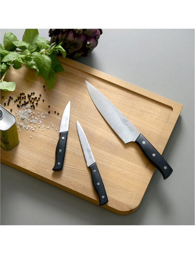 Lion Sabatier Austral are stainless steel knives with black ABS plastic handles. Herb knife 9 cm, tomato knife 13 cm, chef's knife 20 cm.