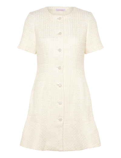 A feminine white tweed mini dress with a flattering, tailored fit and classic button-down front. Finished with short sleeves and a subtle flared hem, this dress blends timeless elegance with modern ease - making it a beautiful and versatile addition to your everyday wardrobe.