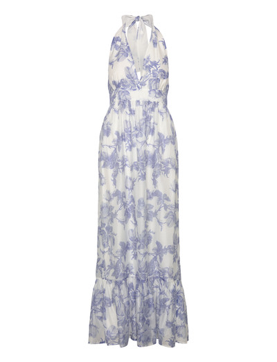 A breezy halter-neck maxi dress featuring a soft white base with delicate blue floral print. Designed with a deep V-neckline, an adjustable tie at the neck, and a flattering defined waist. Perfect for summer events, holidays, and warm-weather occasions.