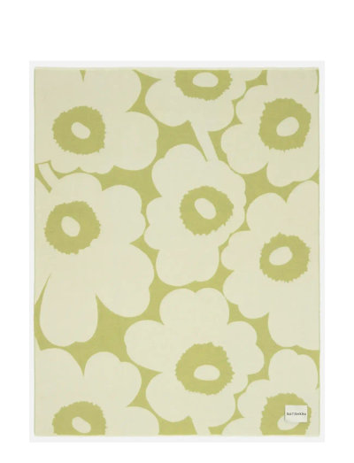 This jacquard knit blanket features the Unikko pattern and the Marimekko label on the bottom edge.