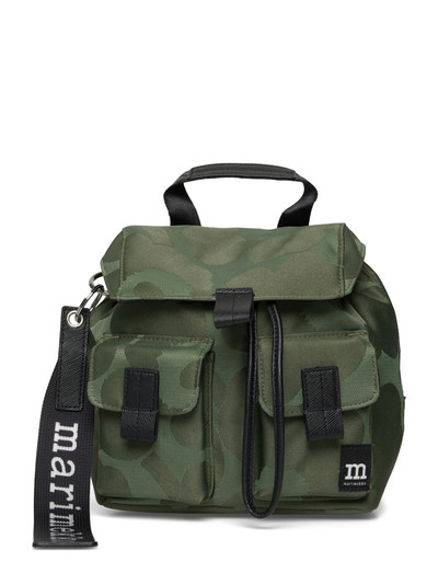 The small Everything Backpack S is made of polyester with the jacquard knit Unikko pattern. The backpack has a drawstring closure, a front flap with a magnetic button closure, and two front pockets with magnetic button closures. The adjustable shoulder straps are made of recycled polyamide, and they feature the jacquard knit Unikko pattern. There is a Marimekko keychain on one side and a slip-in pocket in the back.