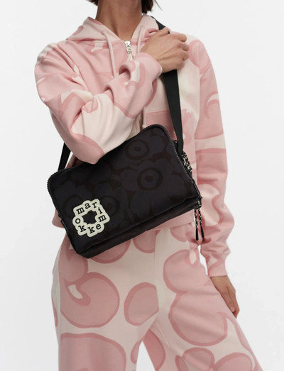 The Kavari shoulder bag features the Mini Unikko pattern. The bag has three different compartments, all with zipper openings and cord pullers. The front compartment features a mesh pocket on the inside. The bag has an adjustable shoulder strap and a cord loop on one side for hanging a keychain. The circular Marimekko logo patch sewn on the front is made of recycled silicone.