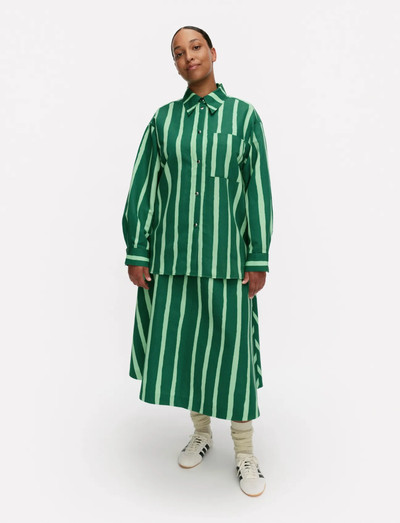 The Kokoelma button-up shirt has an oversized, straight fit and it features the Piccolo pattern, which is printed in Helsinki. The shirt has a snap button closure, a back yoke seam with pleats, one chest pocket, and a curved hem. The cuffed sleeves have slits and snap button closures.