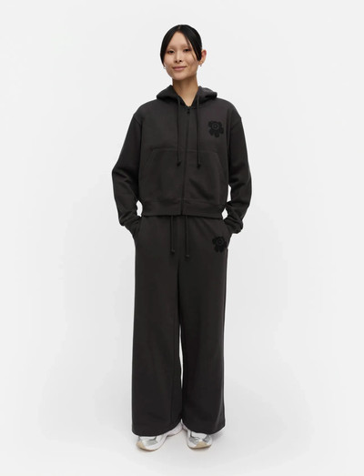 The Naturaali sweatpants have a relaxed fit and wide trouser legs. The sweatpants feature the printed Unikko flower on the left thigh, drawstrings at the waist, and side seam pockets. There is one patch pocket in the back.