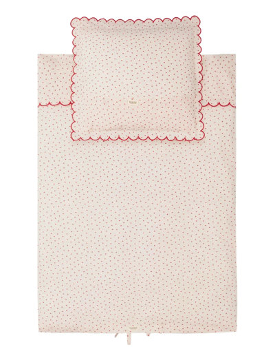 Junior bedding set with duvet and pillow cover. The duvet cover closes with tie strings at the bottom. The bedding has delicate wavy details and measures 100 x 140 cm.