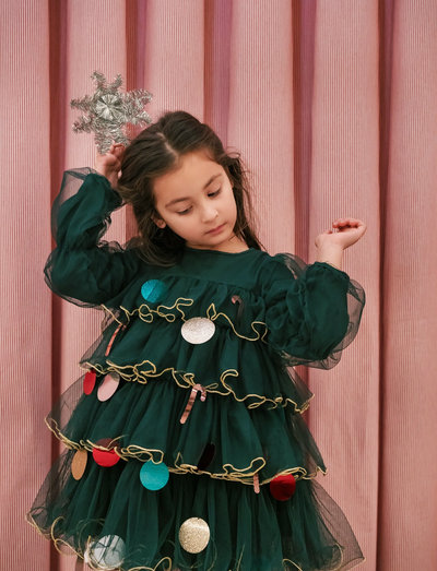 Long-sleeved tulle dress with plenty of volume and a soft cotton lining. The dress is adorned with decorative Christmas ornaments and contrasting trim. The dress has a button closure at the back and goes above the knee.