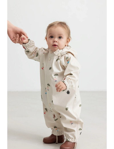 Rainwear suit for the little ones with a good fit and Moomin print. The rain suit have a pocket in front, detachable hood, bootstraps under the feet and closes with a zipper and snap buttons at the front.