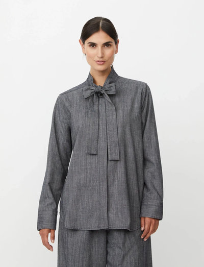 Crafted with a self-tie neckline, this long-sleeved shirt offers a touch of refined style. The design features a button-up front and a gently curved hem, making it a versatile addition to any wardrobe.