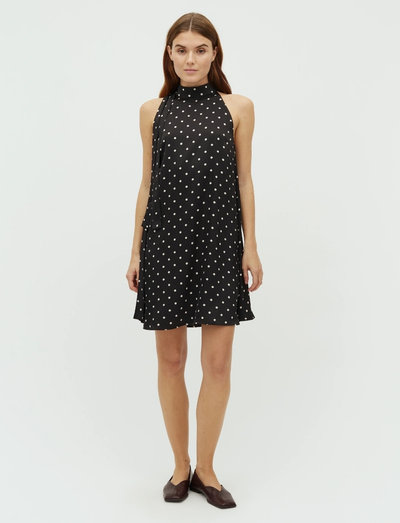 Featuring a halter neckline with a self-tie bow, this dress offers a flattering silhouette. A waist tie cinches the figure, while the playful pattern adds a touch of charm.
