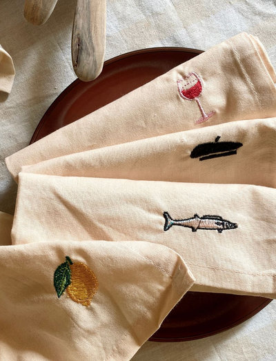 These napkins come in a set of four, with four individual embroideries inspired by france. the fabric is an apricotbeige nuance.the napkins are 40×40 cm in size.these napkins are gotscertified and made in 100 % organic cotton.