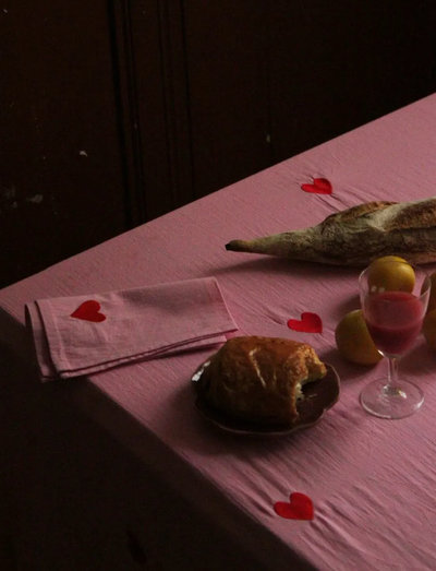 These napkins from Swedish brand Midnatt come in a set of four. Each napkin has a bright red heart embroidered on them. The color of the fabric is a bright pink and the size is 40×40 cm. The napkins are GOTS-certified and made in 100 % organic cotton.
