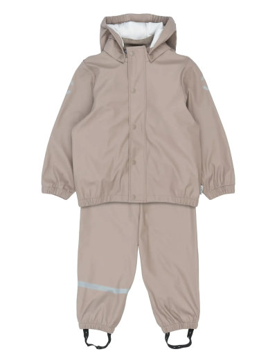 Mikk-lines classic PU rainwear set without suspenders. This rainwear set is made of waterproof fabric, and it is designed for children to have fun in the rain, jumping puddles, sliding down the wet slide, playing in the wet sandbox etc. Place the adjustable foot straps underneath the wellies/boots to prevent the pants from sliding up and keep the feet dry. The set also features a name tag with room for more than one name, so please pass it on and let it be re-loved. EXCELLENT & FUNCTIONAL DESIGN- Solid-coloured.- Fleece lining around the neckline.- Smooth-running YKK zipper with pull tab.- Zipper coverage. - Chin protection (zipper garage).- Adjustable elastic inside the pants' waistband. - Elasticated cuffs at hands and feet.- Detachable hood with snap buttons.- Adjustable foot straps. - Strong reflective details. - Name tag. TECHNICAL ADVANTAGES- Waterproof fabric and welded seams (water pressure 5,000 mm). - Windproof.- Wear-resistant material. - Easy-to-clean.- Dirt repellent. - Nickel-free.- OEKO-TEX® Standard 100.- Base layer of shell fabric: 100% GRS Certified Recycled Polyester- Shell fabric coating: 100% Polyurethane- Lining: 100% Polyester fleeceLuxkids is GRS certified by Control Union, 842535. Only the products which carry the GRS label and claim are certified.