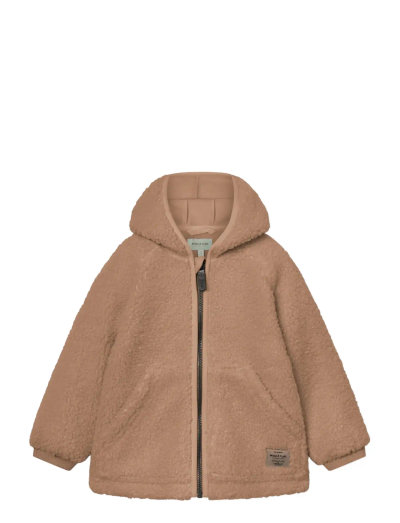 Soft teddyfleece jacket from MINI A TURE. The jacket is made from recycled polyester, and has a signature, pointed hood with tassel