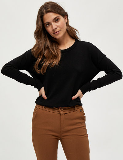 Very nice knit pullover with round neck and drop-shoulder. The knit has long sleeves and ribbed details at the sleeves, neck opening and bottom hemline. The knit is made in a stretchable viscose quality and is very comfortable to wear.