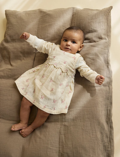 Sleeveless dress from Minymo. The dress features an all-over print and embroidery detailing around the chest. The dress is made from 100% cotton.