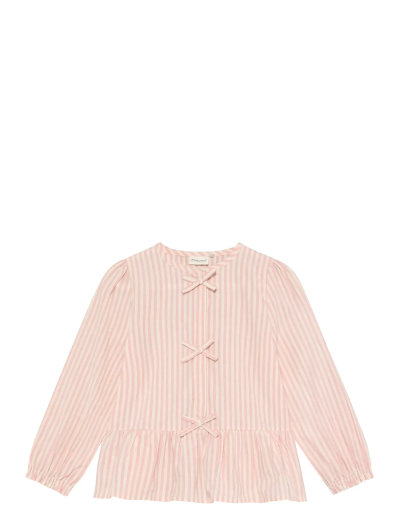 Striped top from Minymo with decorative bows along the front. The top features a round neckline, elastic sleeve ends, and a flared hem for a comfortable fit.