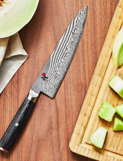 Miyabi 5000 fcd. the core is embedded in 48 layers of steel which create each knife’s unique damascusdesign. the symmetrical cutting edge is honbazuke honed. this threestage grinding, sharpening and polishing process gives the knife razorlike sharpness. the entire length of the edge can be used to cut as there is no finger guard. the join between handle and bolster is completely smooth, which helps to prevent calluses forming on the thumb and forefinger and gives a comfortable grip. hand wash only for best care and avoid cutting on glass, ceramic or stone boards as these will prematurely dull the edge. maintain and sharpen using whetstones.