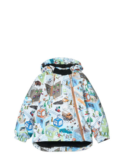 This winter jacket from Molo is wind and waterproof and made of recycled polyester with a unique leopard print. The jacket has a detachable, lined hood, two zippers on the front with internal flaps, and a ribbed edge as a chin guard to prevent the skin from getting caught. Reflective bands on the sleeves, back, and hood, as well as two reflective stars, increase visibility. The sleeves have an elastic cuff that keeps wind, snow, and rain out and helps to keep the gloves in place. The jacket is lined with recycled polyester fleece and padded with 3M™ Thinsulate™ for optimal warmth insulation.
