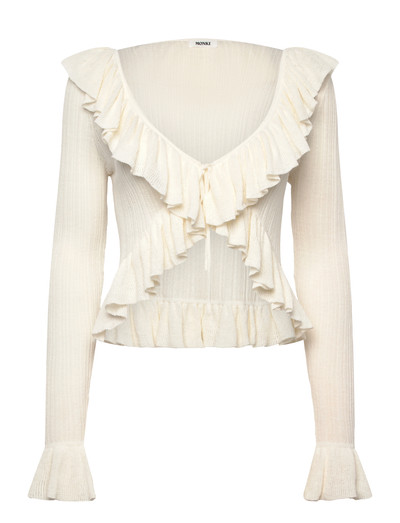 A knitted cardigan crafted from a soft cotton yarn with recycled nylon for a lightweight, comfortable feel. Designed with a plunging V-neckline and a centre-front tie closure, and finished with delicate frilled trims.