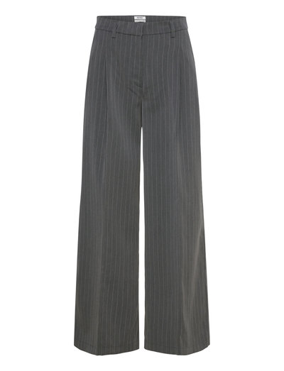 A pair of high-waisted trousers with a loose fit and wide leg. Crafted from structured twill, they feature a sharp front pleat, slanted side pockets, belt loops, and a hook-and-eye zip fly.