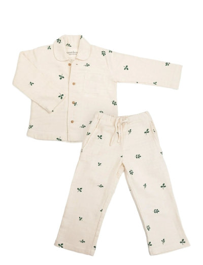 Make bedtime something to look forward to with this cozy unisex pajama set, designed for comfort and style, and made in organic muslin material. The set includes a long-sleeve shirt and matching pants made from breathable fabric for all-night comfort. With an adjustable elastic waistband, these pajamas grow with your child, ensuring a perfect fit every time. Charming details like delicate embroidery, contrast piping, functional pockets, and natural wooden buttons add a practical yet stylish touch, making this set a lovely addition to your little one’s nightly routine.