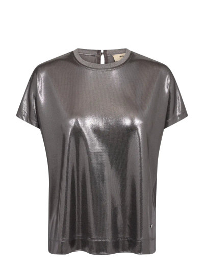 This glamorous tee is stunning addition to your wardrobe. It’s designed in a loose silhouette in a shiny foil finish with ribbed detail at the neck. It looks beautiful with black jeans and an oversize blazer.