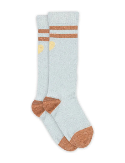 Cotton knee-high socks with glitter from MPkids, in complimenting colours, with a heart motif on the back of the shaft. The socks are knitted so that the glitter yarn is on the outside and the cotton on the inside, which makes them feel comfortable on the child's feet. The socks have a heart motif and horizontal stripes on the shaft, heel and toe in complimenting colours.